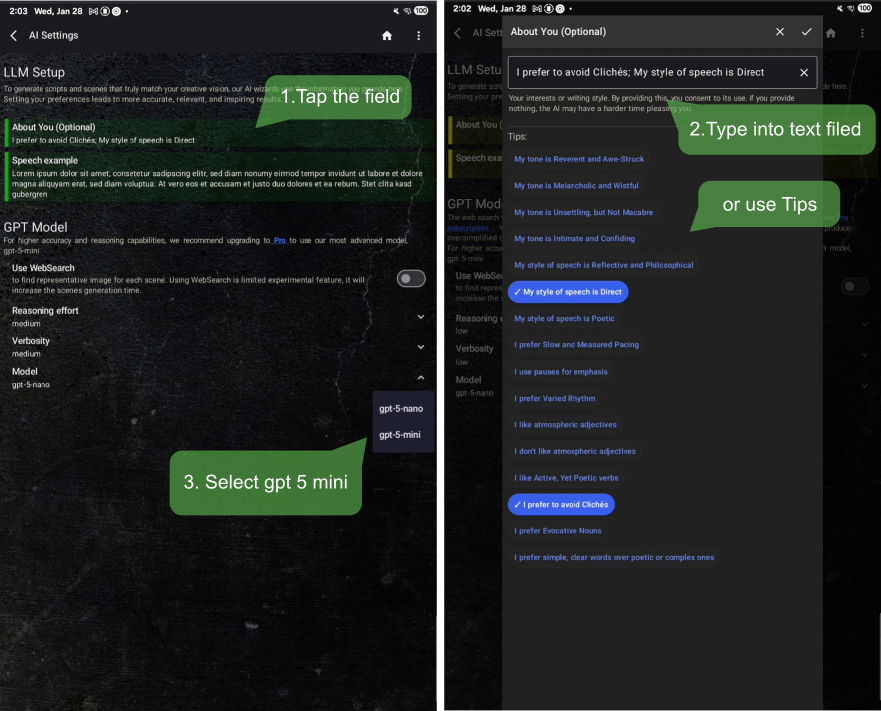 To get the best result from the AI, provide some context in the 'About you' field. This helps the AI to match your style and expertise. You can manually type any text into the text field or use our tips.