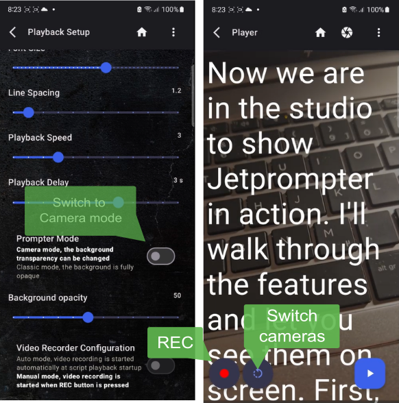 To record the video directly, switch to 'Camera Mode' to overlay your script on the smartphone's camera feed.