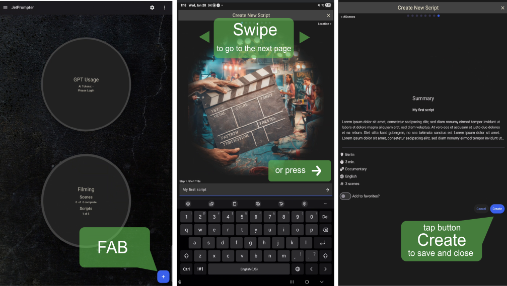 To begin, tap the floating action button (FAB) on the Home screen. This opens the 'Create New Script' dialog.