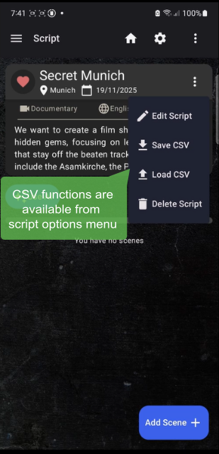 Pro users can export their entire scene list to a CSV file. This is useful for backing up your script, sharing it with colleagues or editing it on a PC. Any edited CSV file can be imported back into the app later, even on a different device.