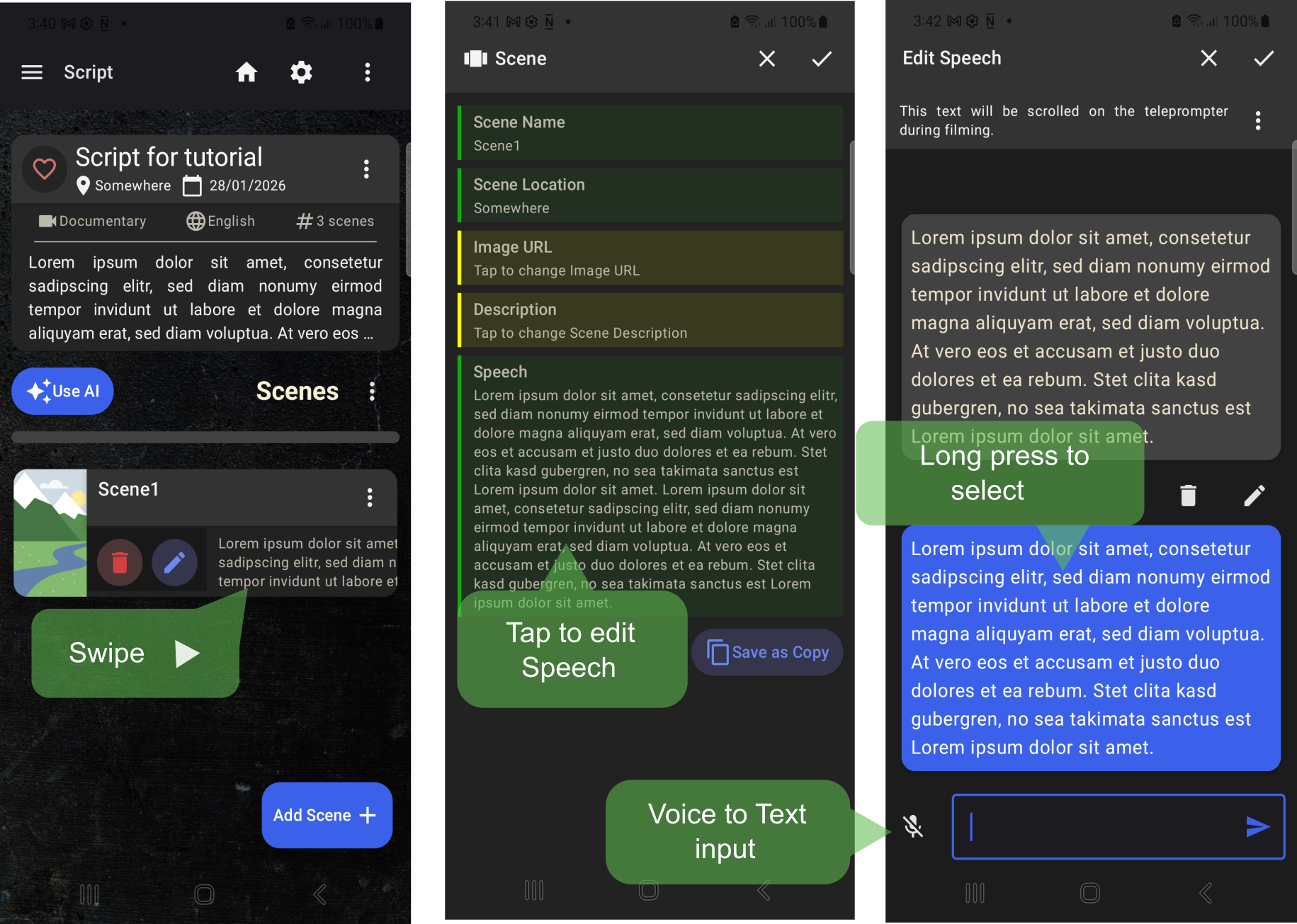 You can manually modify any details of the scene. Use the built-in editor to write your speech. If your text contains new line characters, they will be split into separate speech blocks.