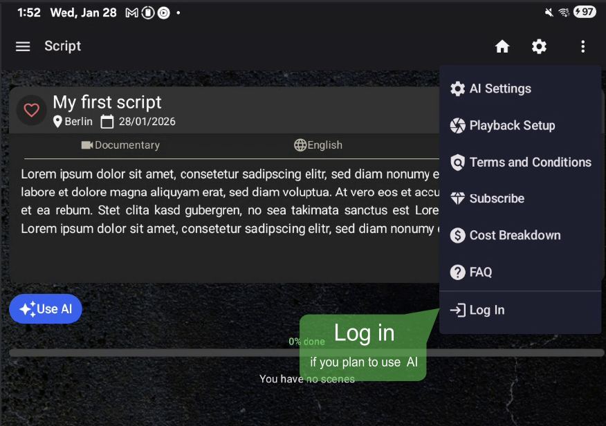 Login is required only if you plan to use AI features for generating or reworking your script, if you are creating everything manually, you can skip this step.
