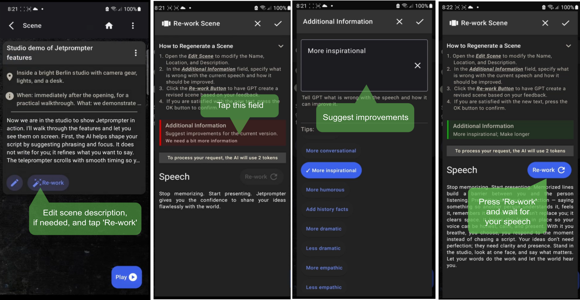 Sometimes AI-generated text needs refinement. In this case, use the 'Rework with AI' tool. Provide guidance on what to improve, then tap 'Rework' button to generate a new version.