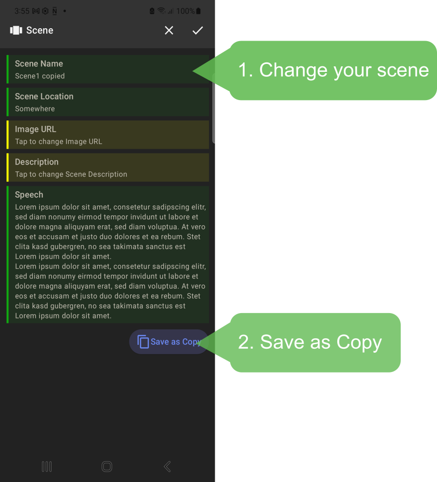 You can add a scene manually at any time by tapping the plus button (FAB) on the 'Scene List' page. Provide meta information as needed. Most fields are optional.
