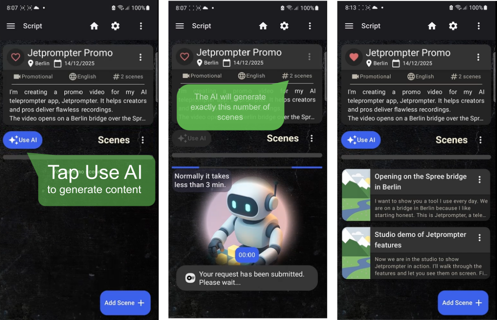 Return to the 'Script Details' page and tap the 'Use AI' button to have the AI generate your scene list automatically. You can continue working in the app while scenes are being generated.