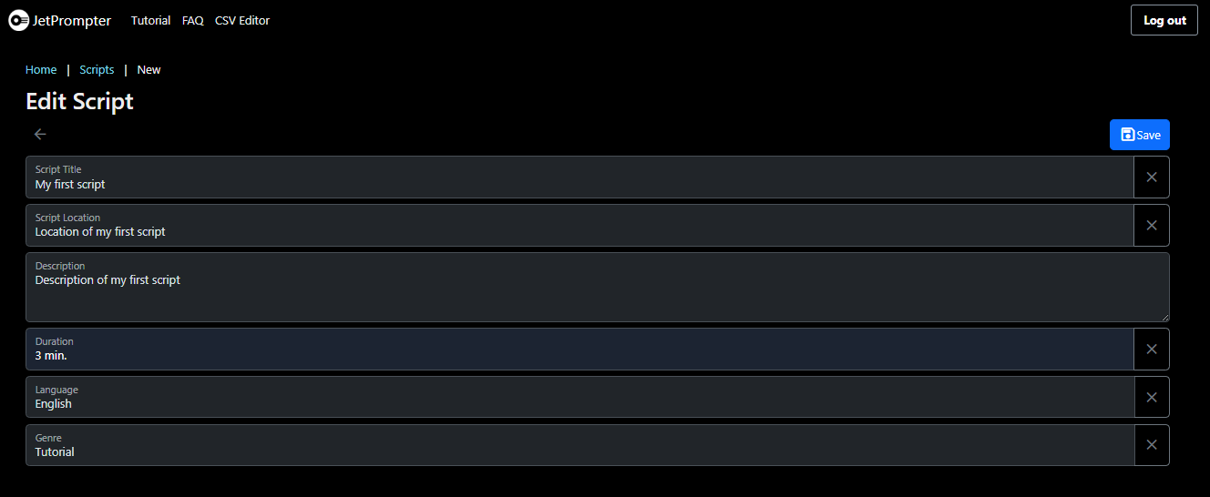 To create a new script, press the "Create New" button on the dashboard. A form will appear where you can fill out the script properties (see picture below).