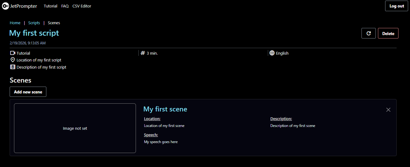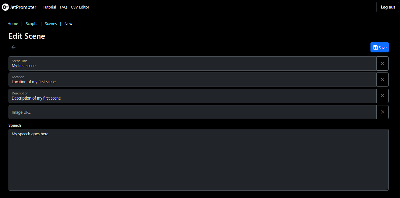 On the Scenes page, press the "Create New" button to add a scene to your script. Fill out the scene properties in the form provided, then click the "Save button" to store your changes.